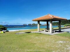 阿嘉島の中心である阿嘉集落のすぐ近くにある前浜ビーチ。前浜は現地の言葉でめーぬはまと読むそうです。ビーチの手前に東屋が一つありました。